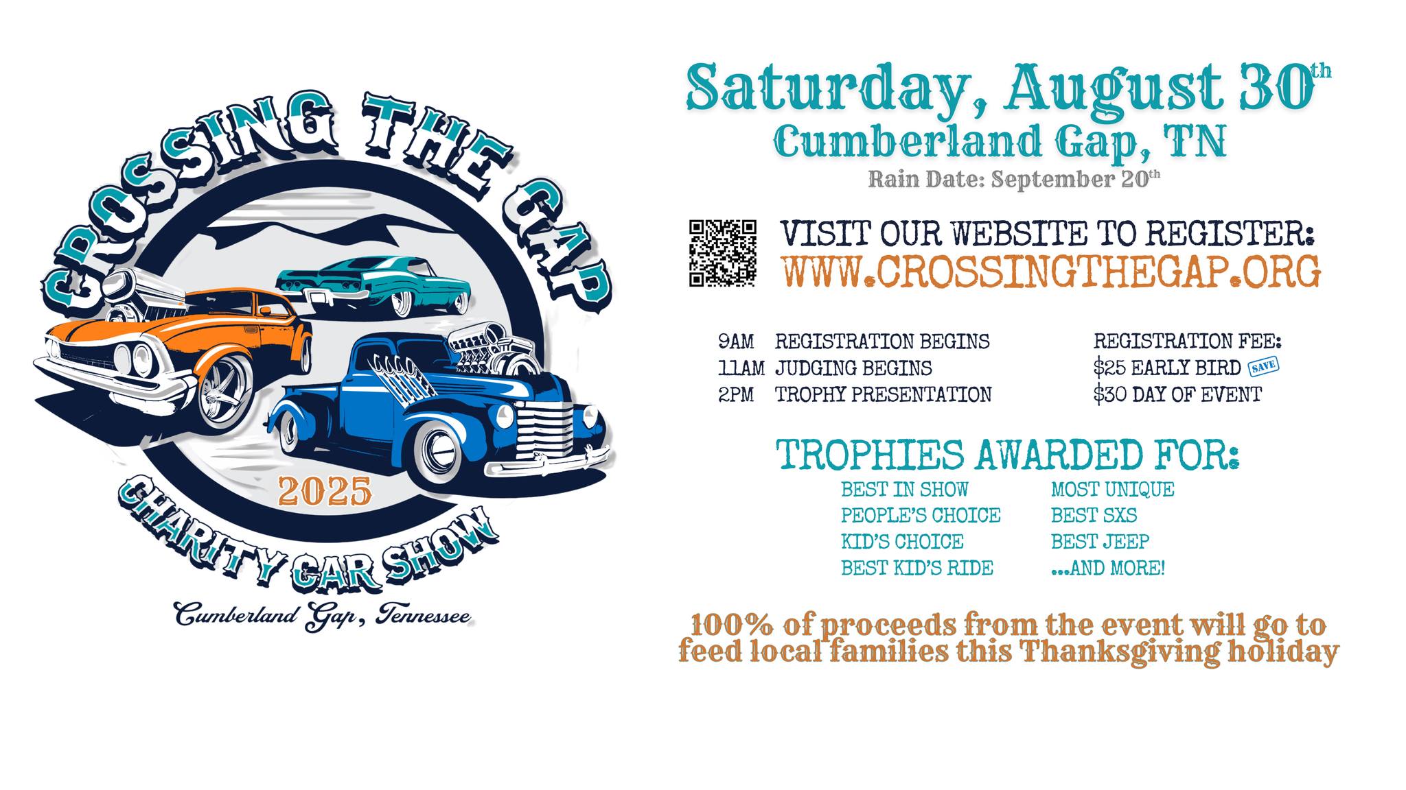 Come join us for our 3rd annual Crossing the Gap Charity Car Show in historic downtown Cumberland Gap TN! There will be door prizes for those registered, peoples choice and kids choice voting for their favorite rides! Judging will begin at 11 am with awards beginning at 2:00!