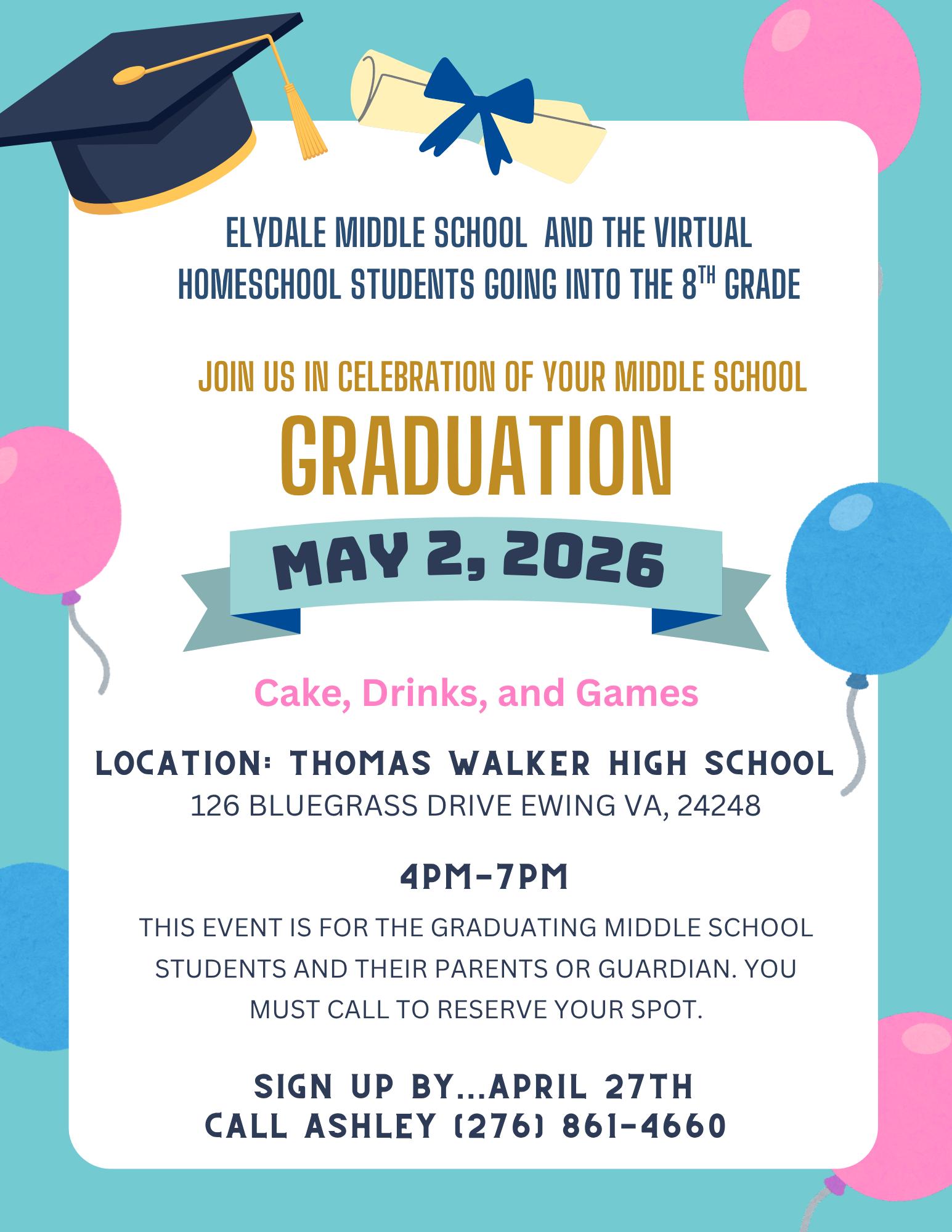 Celebrate a special milestone at the Elydale Middle School Celebration on May 2, 2026, at Thomas Walker High School!