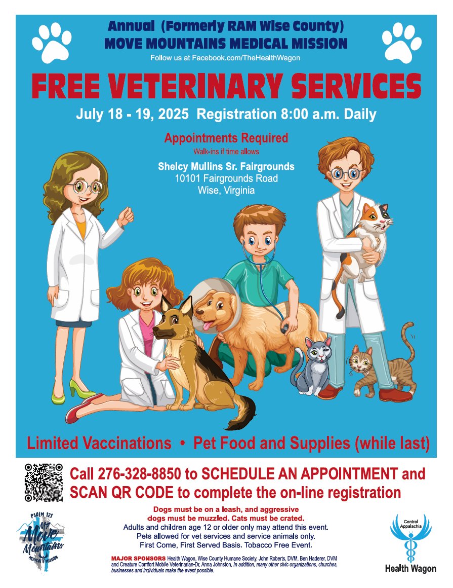 The Health Wagon is proud to announce FREE VETERINARY SERVICES during our Move Mountains Medical Mission 2025 in Wise, Virginia!