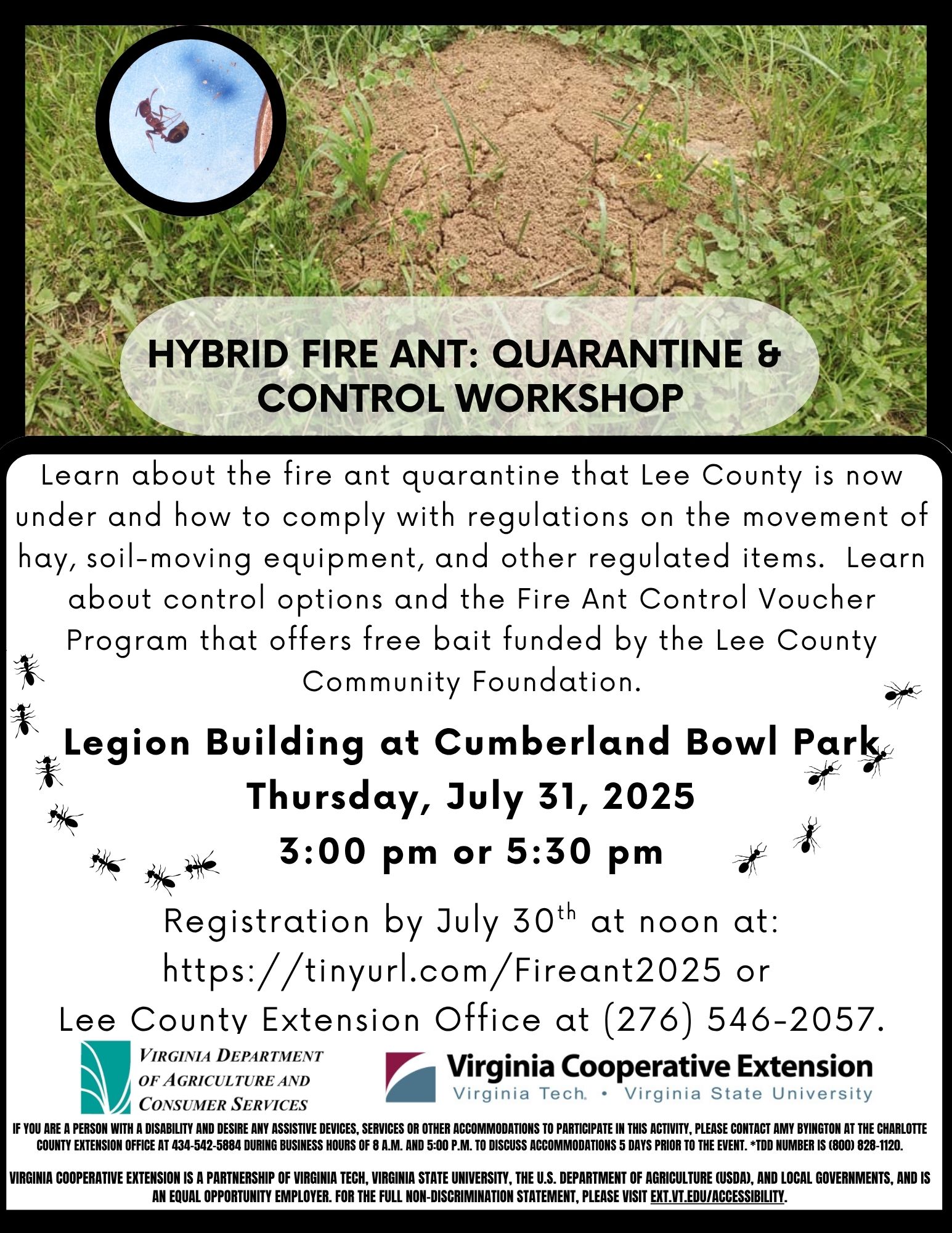 Lee County Extension Office will be holding an informational workshop on the hybrid fire ant quarantine and control on Thursday, July 31st at 3 pm or 5:30 pm at the Legion Building at Cumberland Bowl Park. Registration is requested by Wednesday, July 30, at noon. Please fill out the registration at this link: https://tinyurl.com/Fireant2025 or call the Lee County Extension Office at (276) 546-2057.