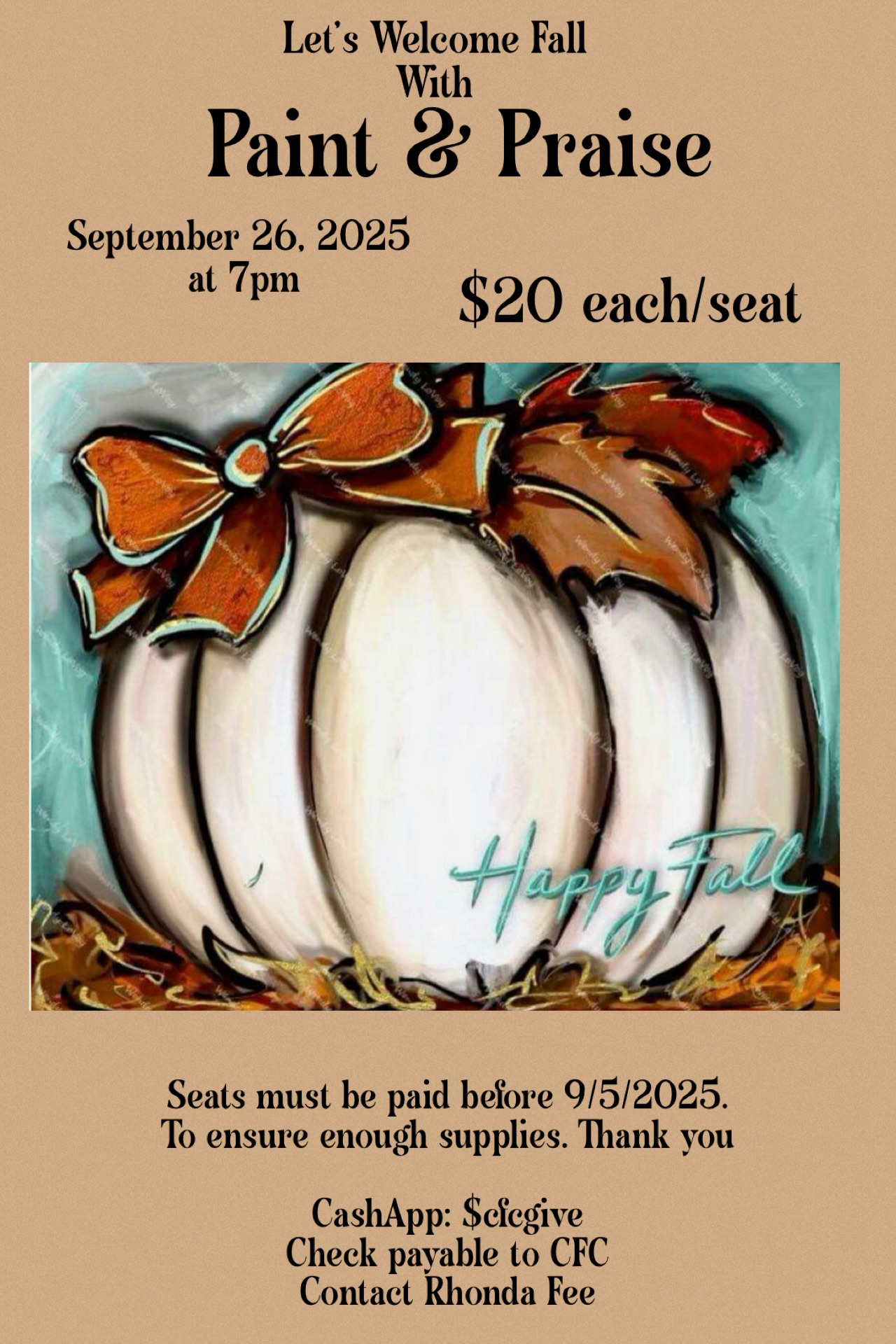 Paint and Praise will be held at CFC Fellowship Hall September 26,2025 at 7pm. There will be refreshments. $20 each seat for paint night. All seats need paid in advance. Due to ensuring enough refreshments and supplies.