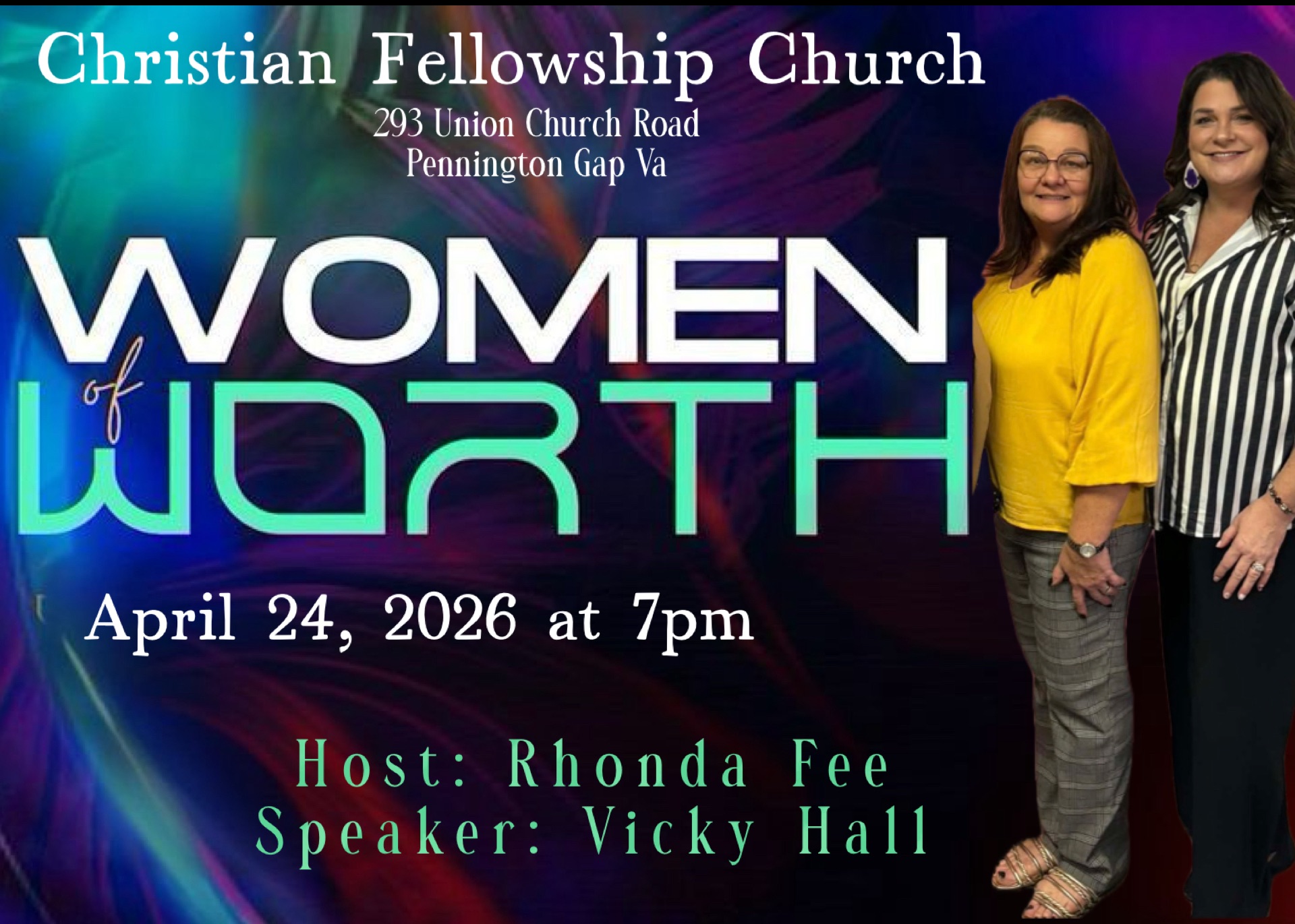 We invite you to join Rhonda Fee with Women Of Worth for a special women’s evening of praise and worship. Vicky Hall will deliver a special message from God. We anticipate a remarkable year ahead. We are delighted you can participate. All woman welcome!!!