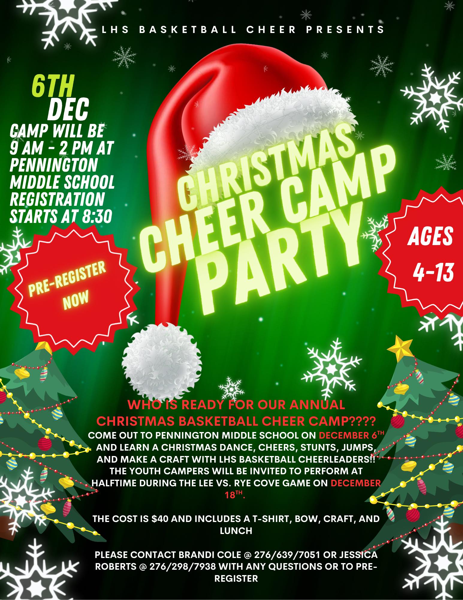 It’s that time of year again!! Come out to learn cheers, stunts, jumps, tumbling, and a Christmas Dance LHS Basketball Cheer is hosting our Annual Youth Cheer Camp! At Pennington Middle School on December 6th from 9 am - 2 pm.The cost is $40 (family discounts available for multiple children residing in the same household) includes camp shirt, bow, […]