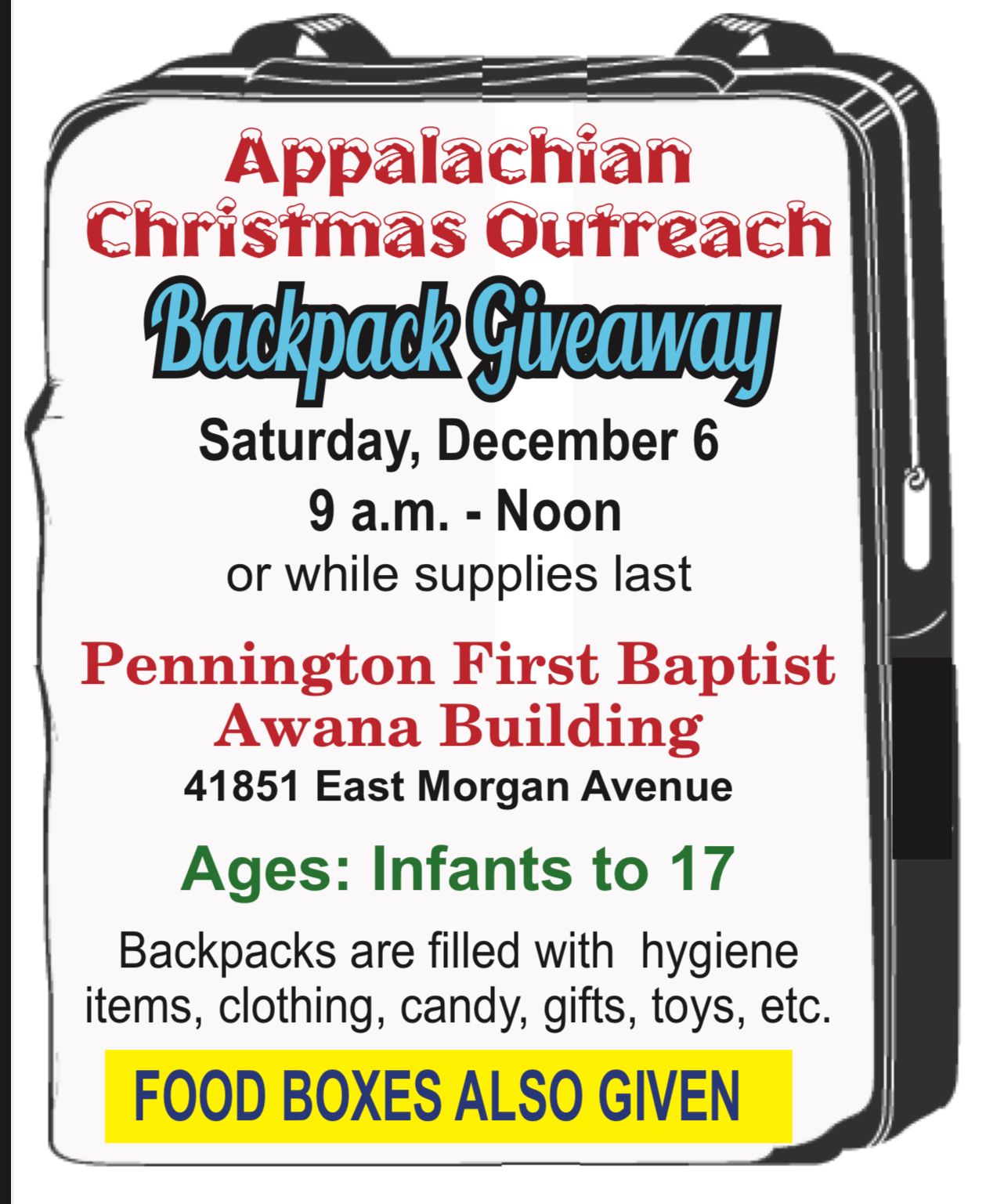 Appalachian Christmas Backpack GiveawaySaturday December 6th 9 A.M-Noon(Or While Supplies Last)*Children Must Be Present To Recieve A Backpack