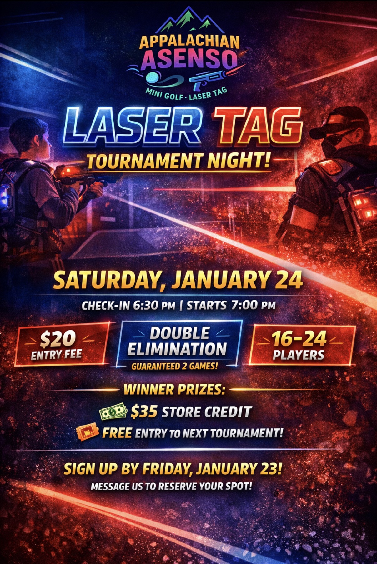 Laser Tag Tournament Night at Appalachian Asenso We’re hosting our first-ever Laser Tag Tournament and we’re keeping it competitive and fun! Saturday, January 24 Check-in: 6:30 PM | Games start: 7:00 PM $20 entry per player 16–24 players total Double elimination — everyone is guaranteed at least 2 games Prize for the winner:• $35 store credit• FREE entry into […]