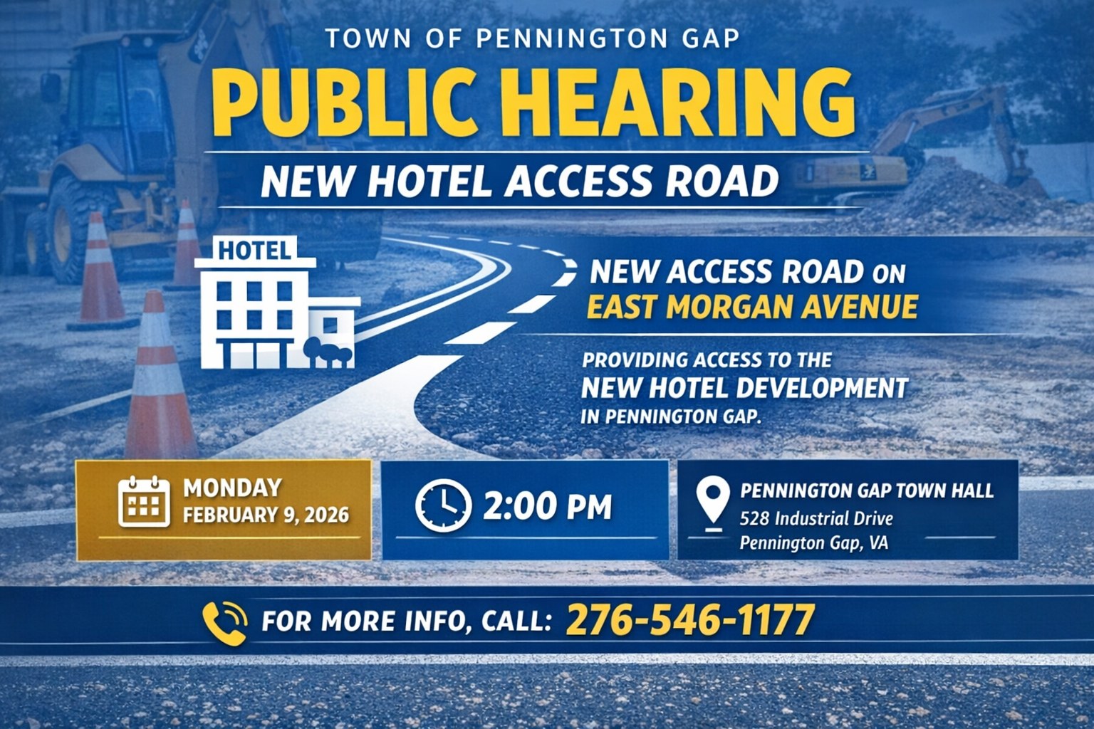 The Town of Pennington Gap will hold a public hearing regarding the right-of-way for a new access road on East Morgan Avenue Across from Industrial Drive. This road will serve the new hotel development planned for Pennington Gap. Although the Town owns the property, the Virginia Department of Transportation (VDOT) requires a public hearing as […]