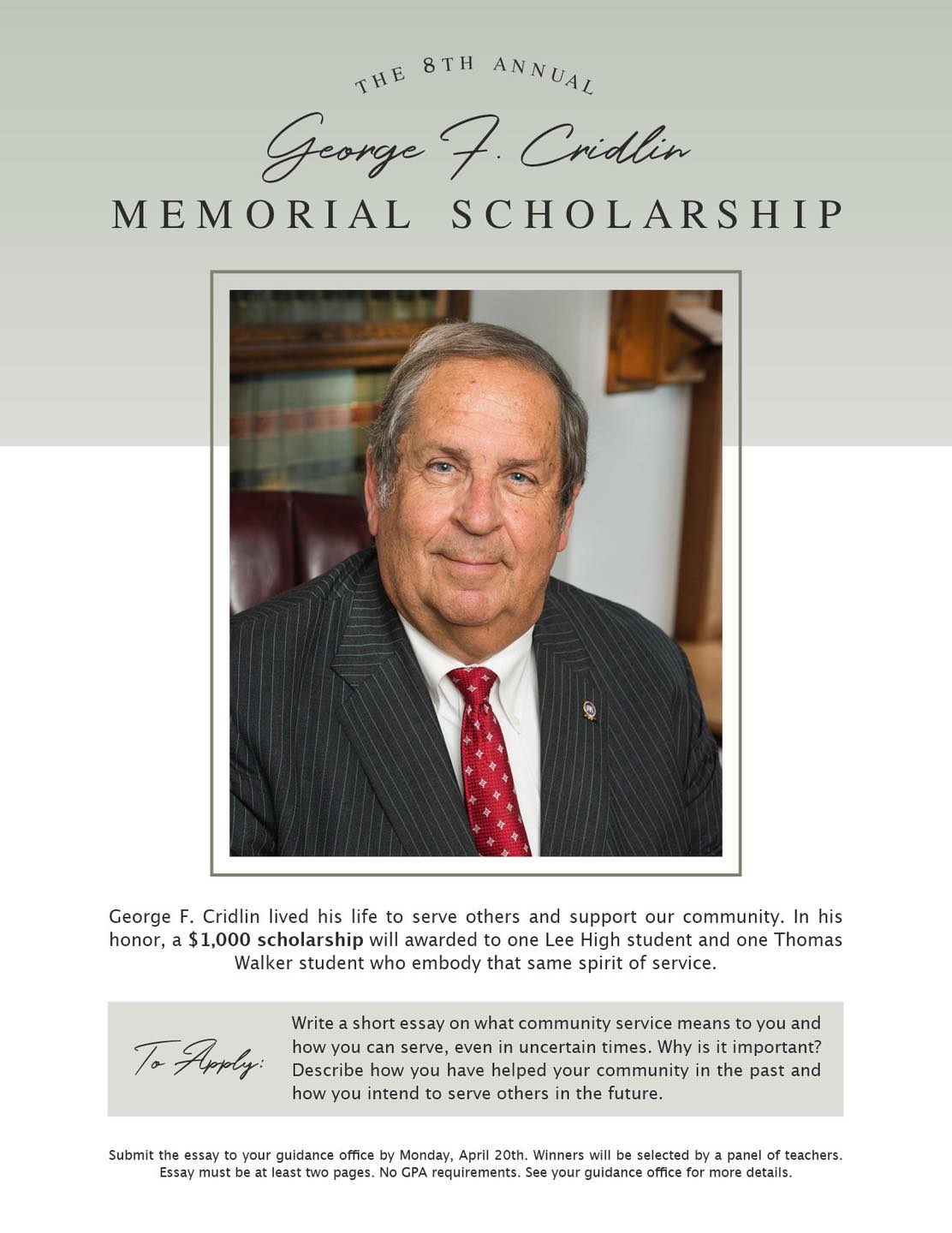 "I’m proud to offer the George F. Cridlin Memorial Scholarship again this year. Since 2019, this scholarship has awarded over $20,000 to students from Lee High and Thomas Walker, honoring my dad’s legacy of service and giving back.To apply, students must submit a two-page essay on the importance of community service, a cause that meant […]