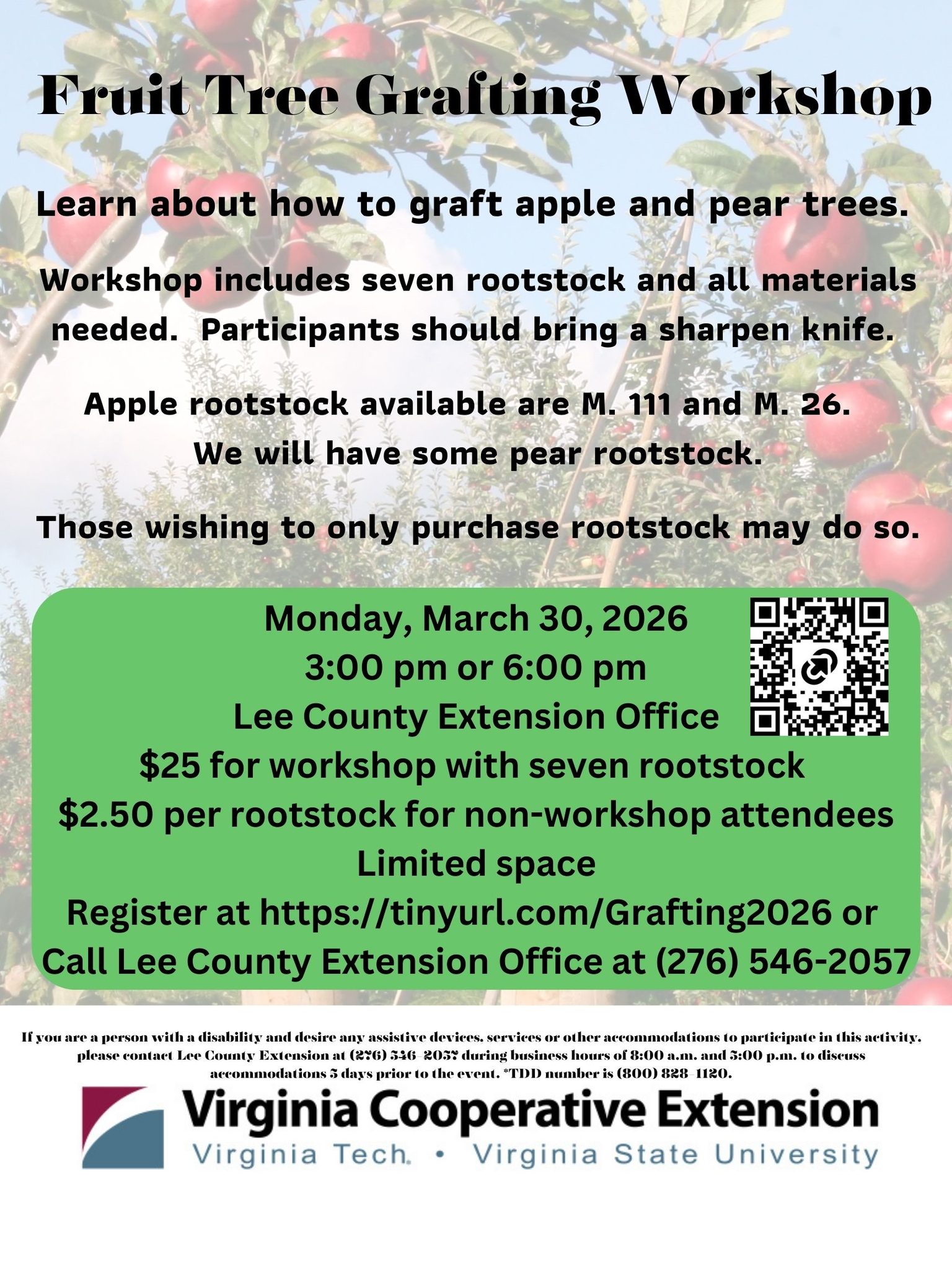 Monday, March 30, 20263:00 pm or 6:00 pmLee County Extension Office$25 for workshop with seven rootstock$2.50 per rootstock for non-workshop attendeesLimited spaceRegister at https://tinyurl.com/Grafting2026 orCall Lee County Extension Office at (276) 546-205