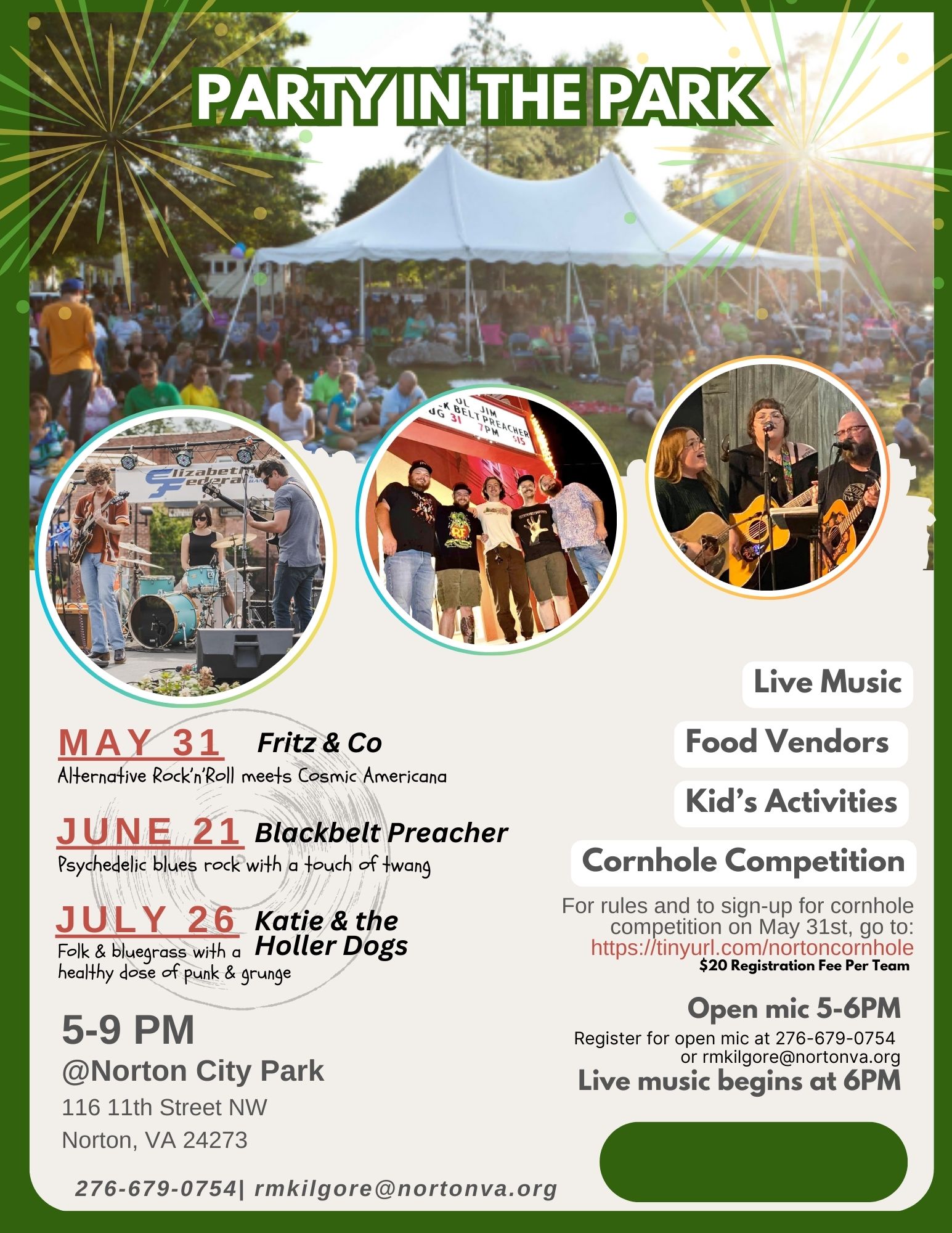 The first Party in the Park event is this month! Don't miss out on this FREE EVENT on Saturday, May 31, 2025. Bring your lawn chair, blanket, family, even the dog!Fritz & Co.. will sling some tunes at Norton City Park(116 11th St., Norton, VA 24273).Grab a buddy and register for the Cornhole Competition. Winners […]