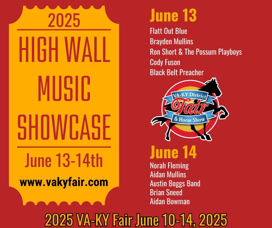 Get ready for an unforgettable weekend of live music at the **2025 High Wall Music Showcase** – part of the **VA-KY District Fair & Horse Show**! June 13–14, 2025 10101 Fairground Rd. Wise, VA 24293 www.vakyfair.com **June 13 Lineup:** Flatt Out Blue Brayden Mullins Ron Short & The Possum Playboys Cody Fuson Black Belt Preacher **June 14 Lineup:** Norah Fleming Aidan Mullins Austin Boggs Band Brian Sneed Aidan Bowman Plus, don’t […]