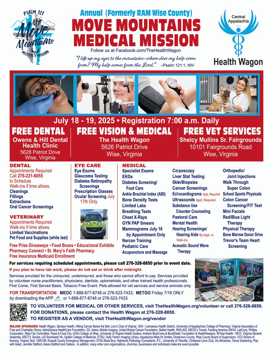 SAVE THE DATES: JULY 18 - 19, 2025! MOVE MOUNTAINS MEDICAL MISSION is BACK - and bigger than ever! (Formerly RAM Wise County)Join us in Wise, Virginia for a life-changing weekend of FREE medical, dental, vision, and veterinary care provided by the Health Wagon and an incredible network of selfless volunteers Locations & Services: FREE DENTAL CARE Owens & Hill […]