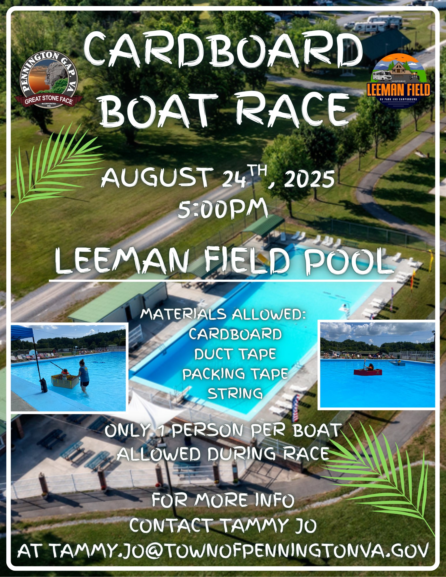 Come out to the Cardboard Boat Race on August 24, 2025 at 5:00 PM at Leeman Field Pool. Only one person per boat is allowed during the race. You can make the boat using any of the following materials: cardboard, duct tape, packing tape, string, and hot glue.